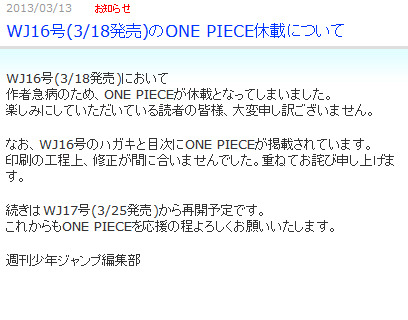 Yshooトップにまで「ワンピ休載」とか載ってるな